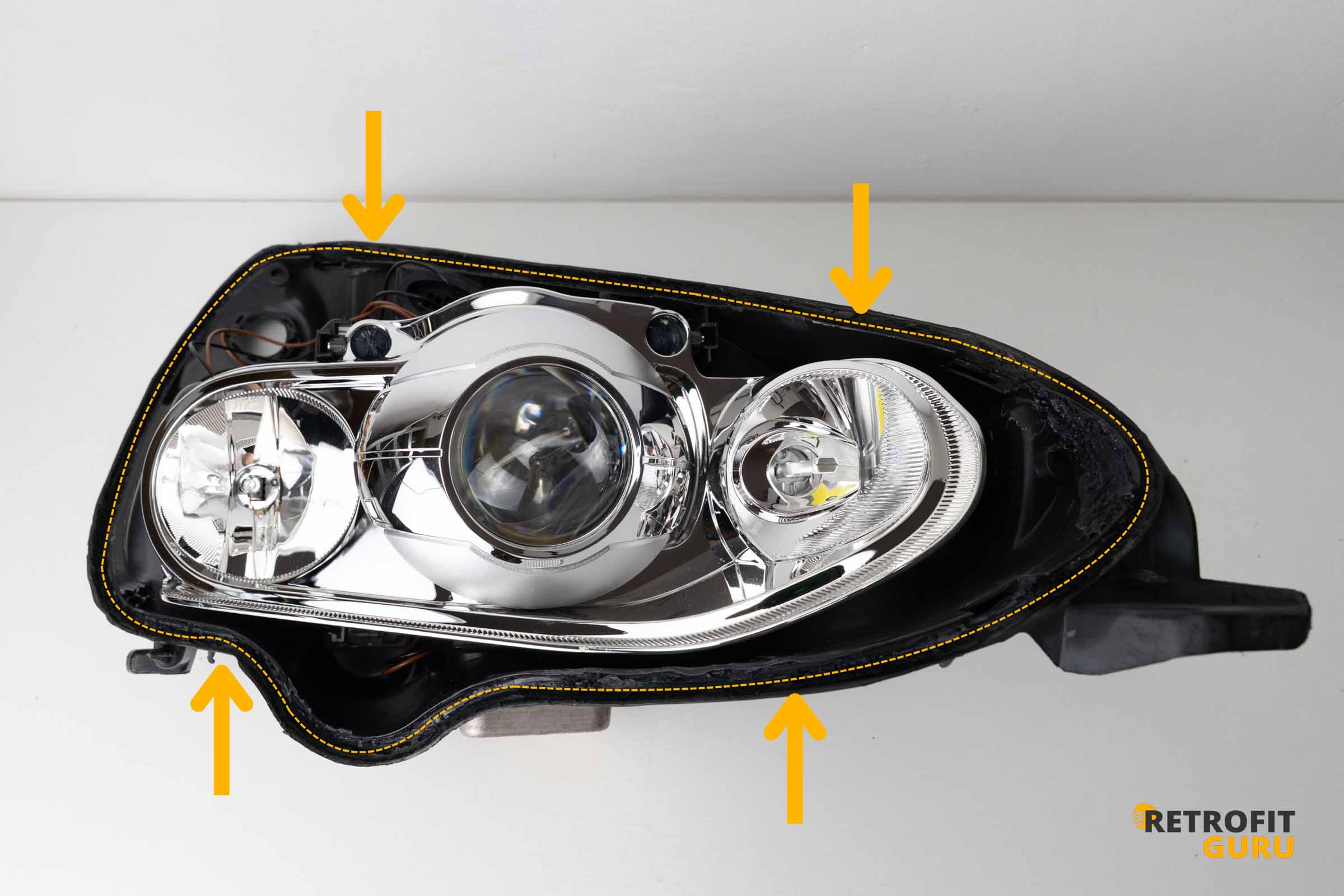 - Nechte světlomet vychladnout, aby butyl ztuhl a vytvořil těsný spoj.
