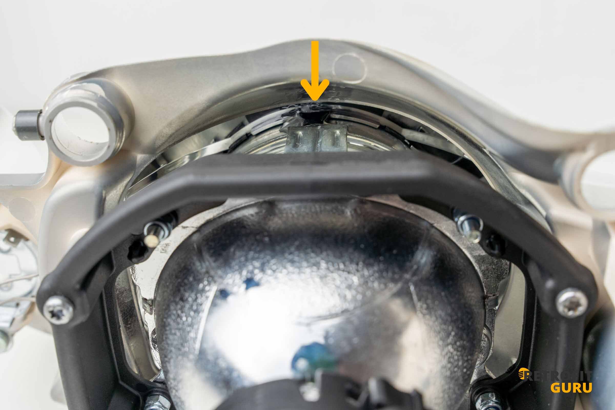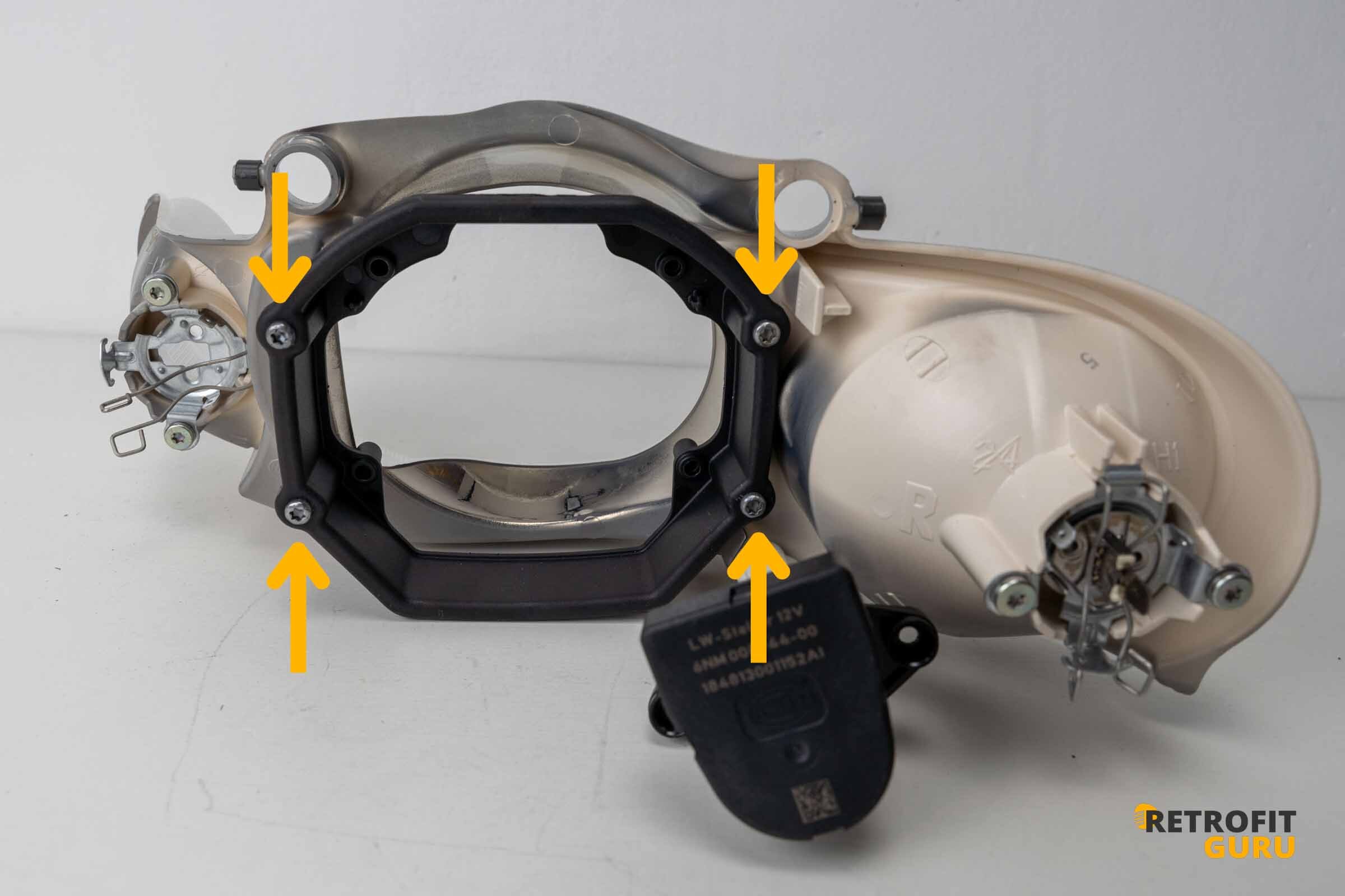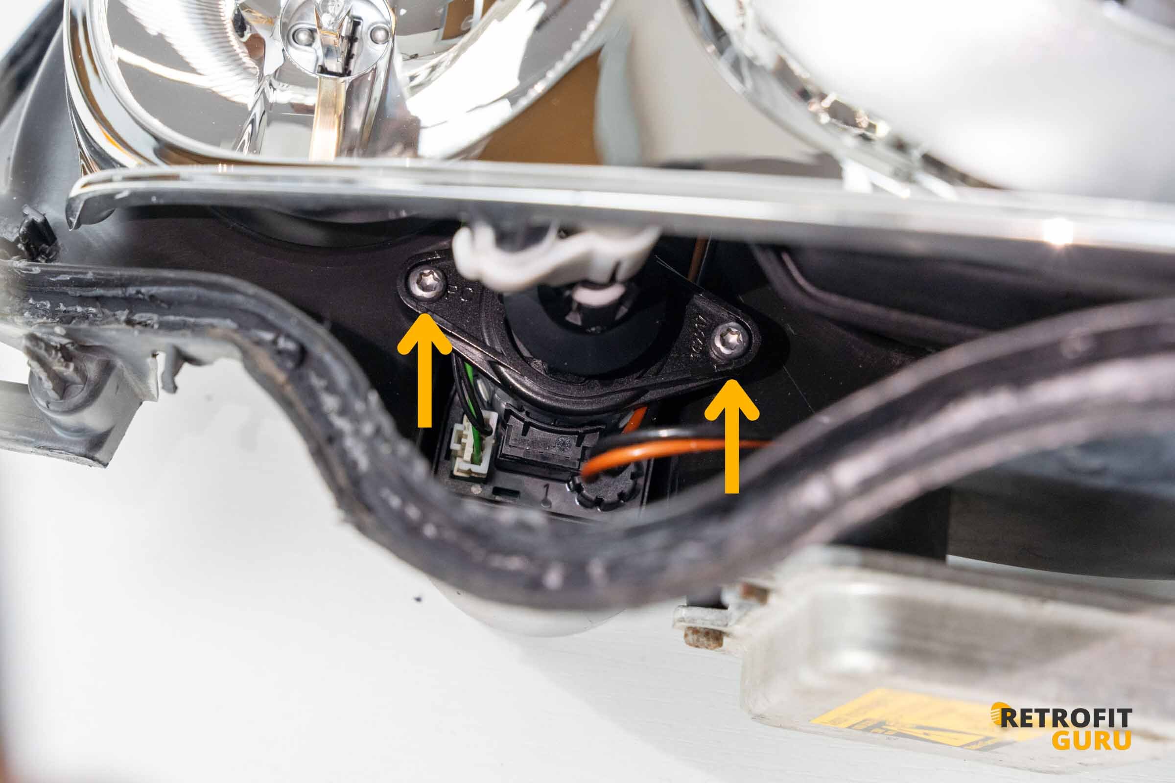 Jako první je nutné uvolnit motorek naklápění světla, protože drží reflektorovou jednotku uvnitř těla světlometu. Motorek je uchycen dvěma šrouby Torx.