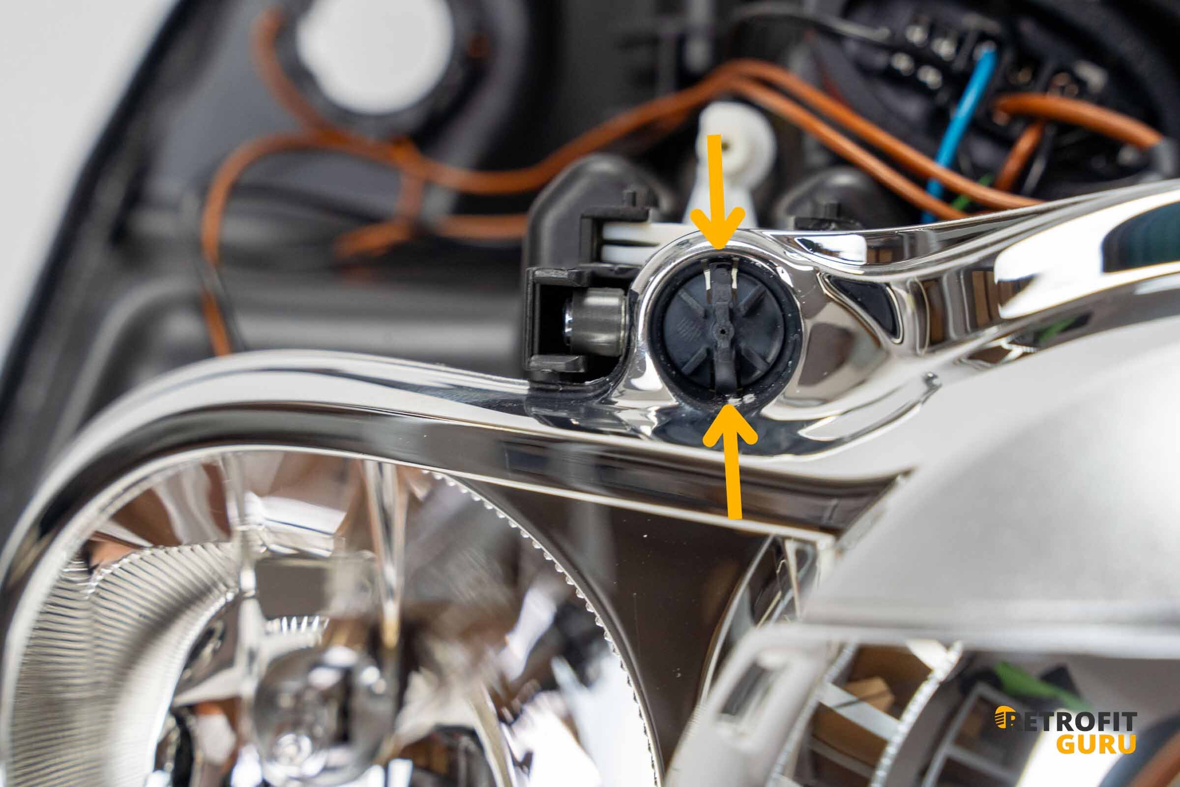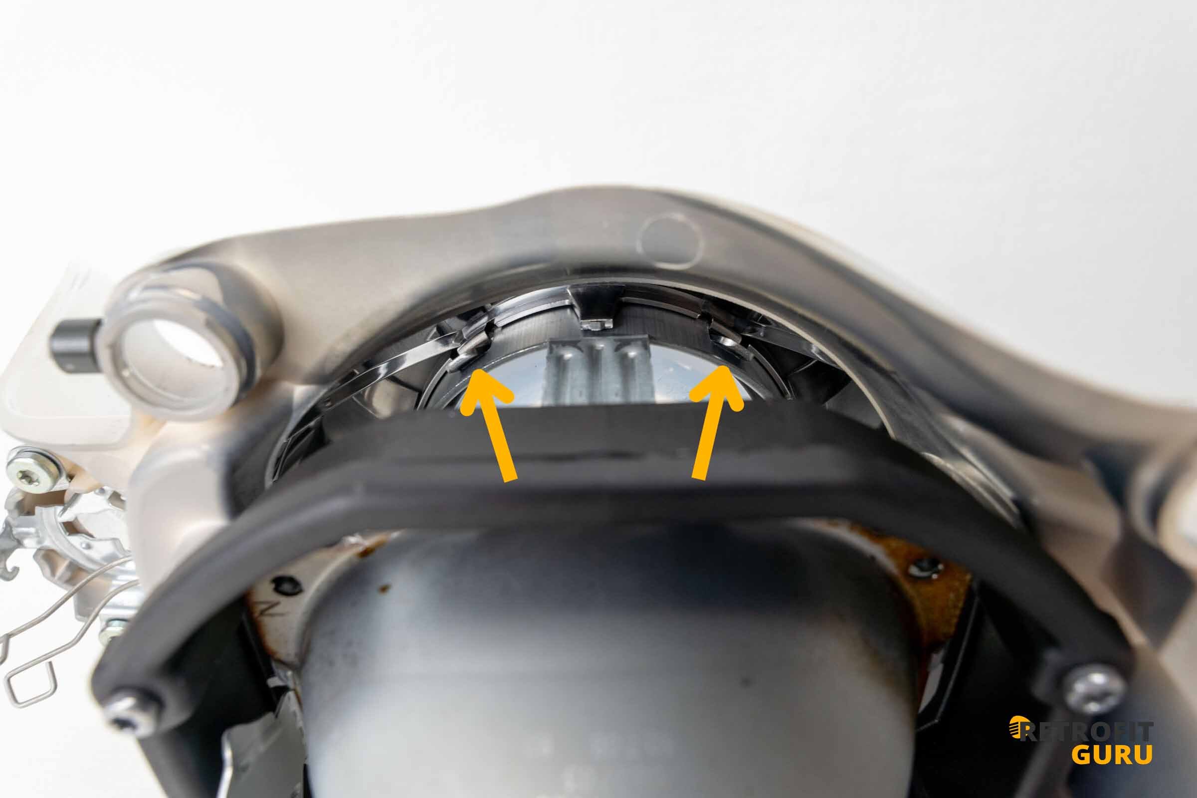 2) Uvolnění dvou horních držáků vnitřní části světlometu
