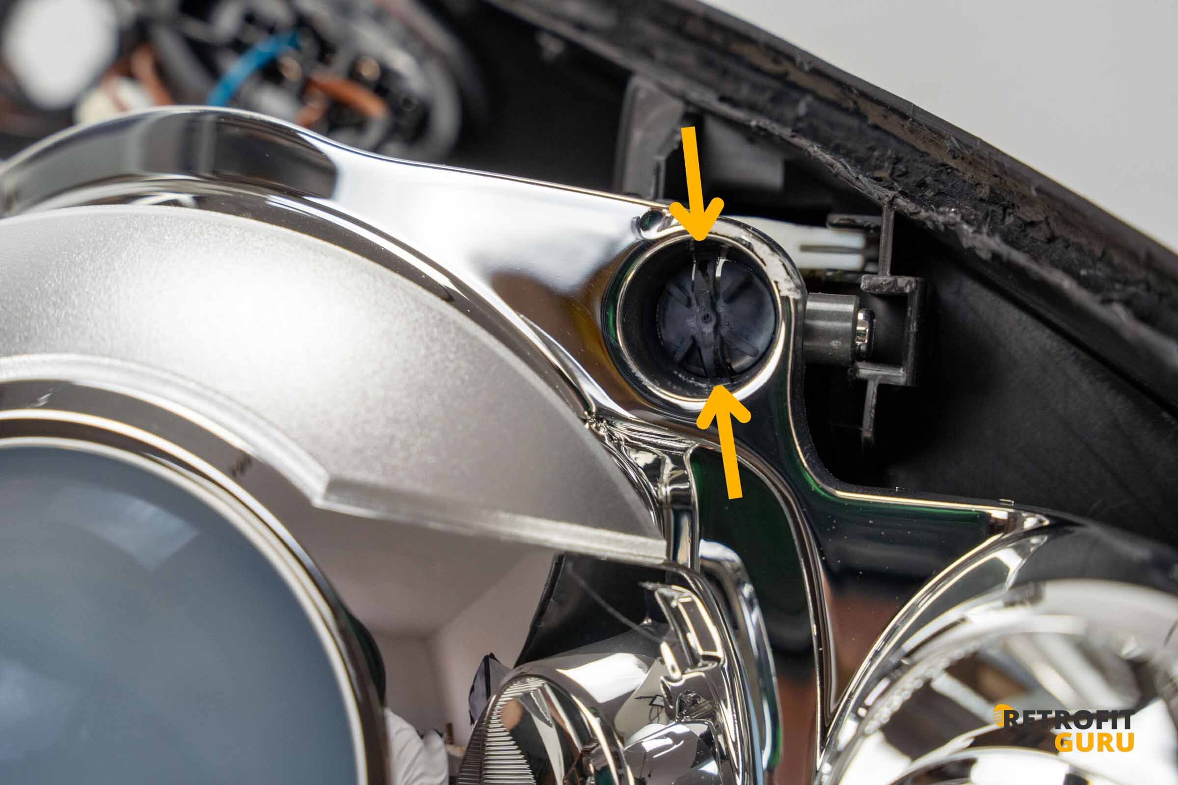 Uvnitř S-Maxu najdete dva horní plastové klipy, které drží reflektorovou jednotku na místě. Ty je potřeba nejprve vycvaknout nahoru, jinak reflektor zůstane v těle zaseknutý.